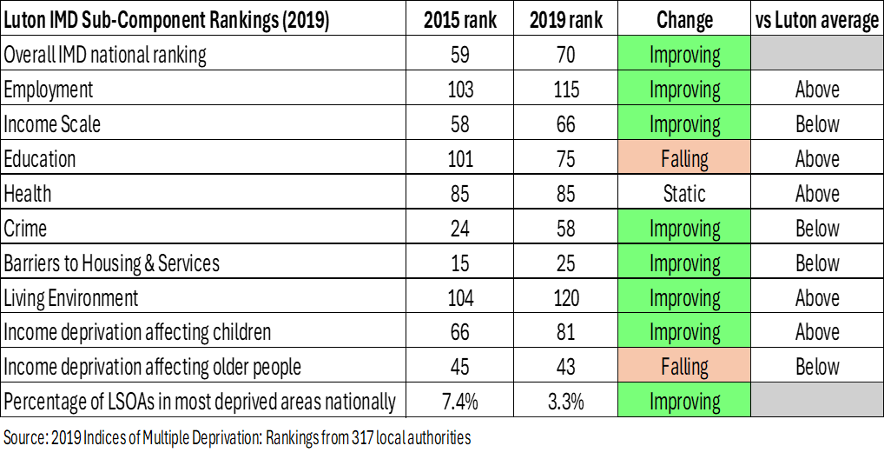 Income deprivation affecting older people is the only sub-component that is both below Luton’s average performance and getting worse. 86% of local authorities in England perform better than Luton.
